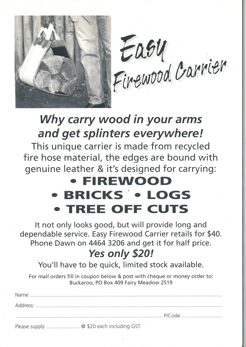 Purpose: Firewood Carrier to assist carrying firewood, bricks, logs, tree off cuts