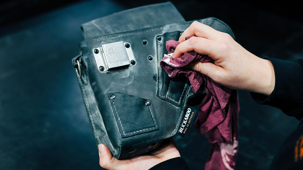Leather is a natural product, and our Buckaroo leather is engineered by us with rich, natural oils that protect the leather over time. Water, dust, dirt, heat, cold and UV will eventually begin to weather the leather, and it will need to be rehydrated with a leather balm. We recommend at the very least an annual clean of your leather products. This should be done using a saddle soap or diluted warm soapy water. The item should be completely dry before adding a leather conditioner. Be sure to apply a liberal coating of leather conditioner, working it into any cracks and scuffs, getting good coverage across the entirety of the exterior. Follow this with a clean rag, making sure to remove any excess conditioner especially on stitching. During this process, it is a good chance to inspect the tool bag for any signs of wear and tear that may need attention or repair by Buckaroo.