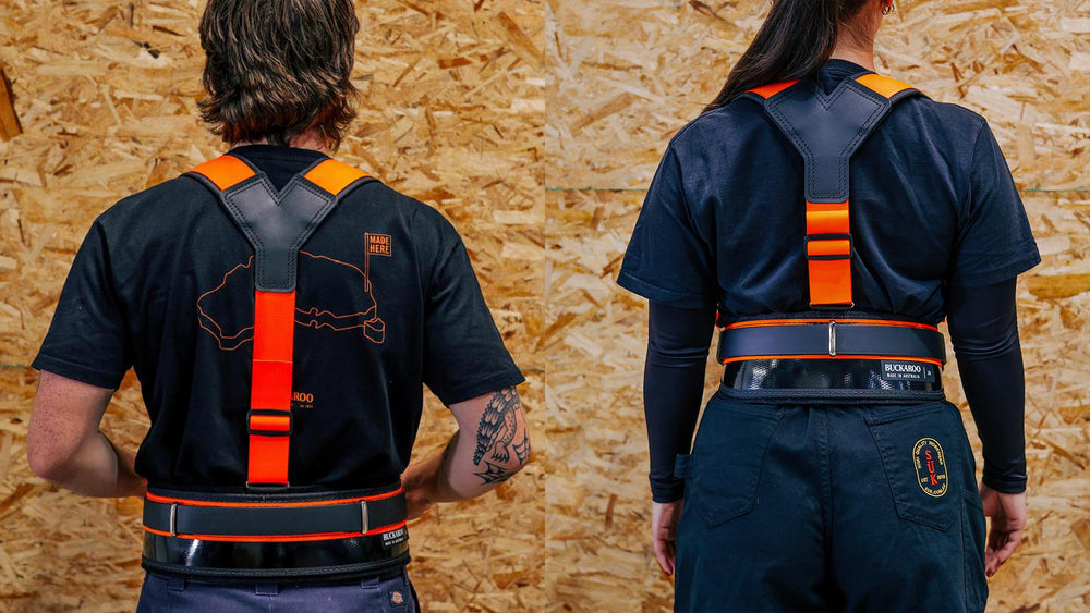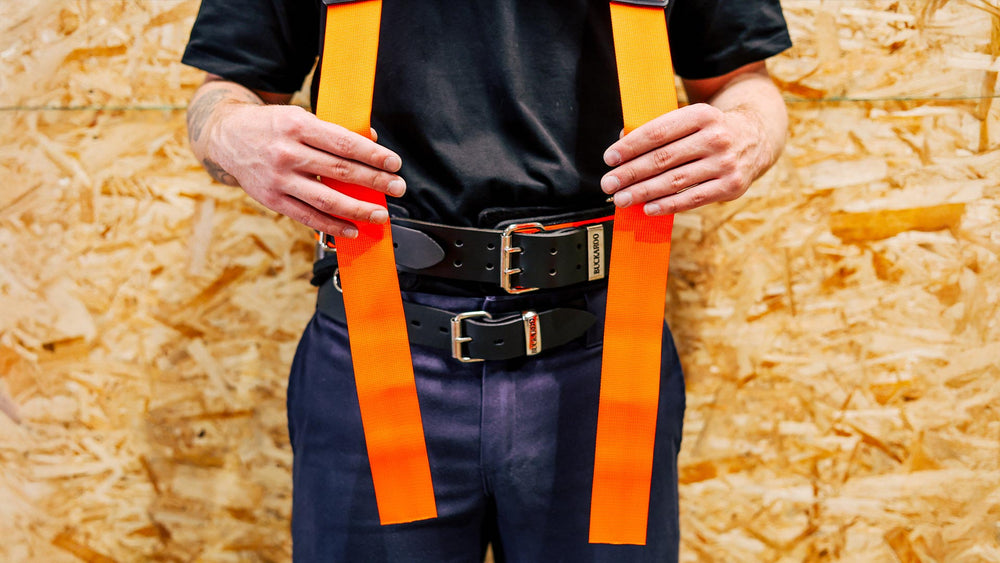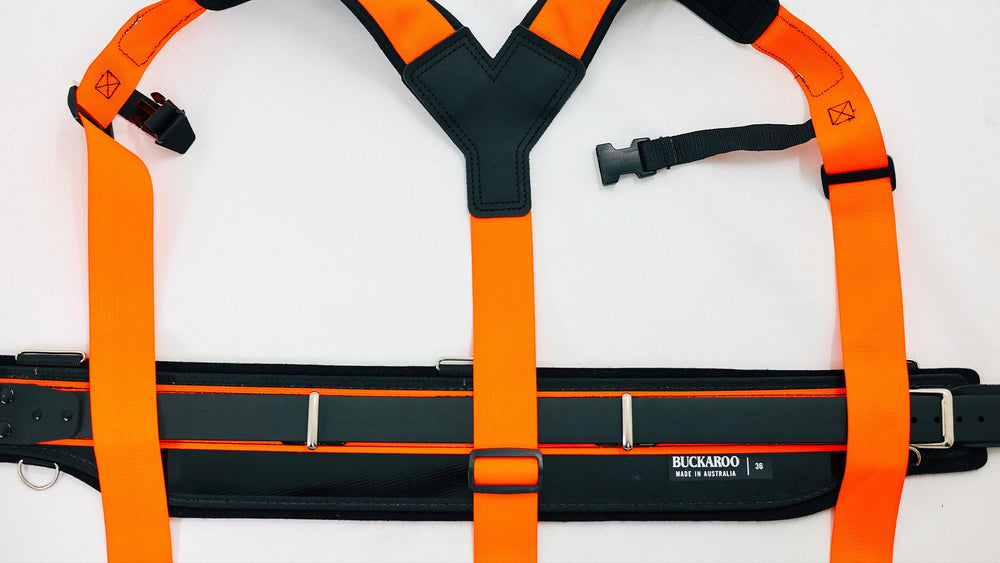 1. Buckaroo braces are designed to further support the belt, they are not designed to have the belt slung from your shoulders around your hips. Proper belt fit is a necessity. Tool belts should be worn higher than a casual belt. Buckaroo suspenders add another layer of lower back protection. They also provide an area to clip pencils, phones and other accessories too.